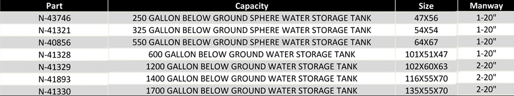 Norwesco’s below-ground water cisterns feature the same rugged, ribbed design found in our Legacy septic tanks and are lightweight for ease of transport and installation. Our cisterns are ideal for instances when drinking water must be hauled in or if a well does not meet consumption needs. Norwesco cisterns are manufactured using resins that meet FDA specifications to ensure safe storage of potable water. Where applicable, Norwesco’s cisterns have been certified under ANSI/NSF Standard 61. The ribbed tanks (600 gallon and larger) need to be kept 1/4 full at all times.