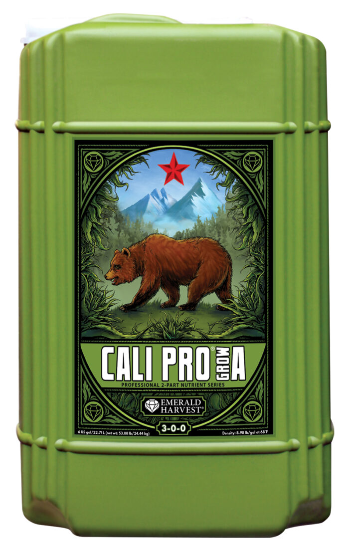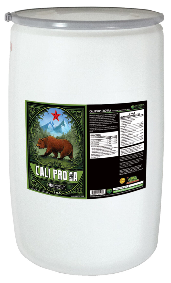 Reach the full genetic potential of your crops with Emerald Harvest® Cali Pro® Grow A & B and Cali Pro® Bloom A & B, our complete 2-part base nutrient series. Cali Pro® is a nitrogen-rich fertilizer that nourishes your high-yield, indoor-grown crops with the essential elements they need to develop strong stalks and stems and support a robust harvest. Cali Pro® is rich in phosphorus, potassium and other essential plant nutrients needed for vigorous fruiting and flowering. It also contains trace elements such as chelated iron, cobalt, manganese and zinc. Use Cali Pro® Grow A & B during the vegetative stage.