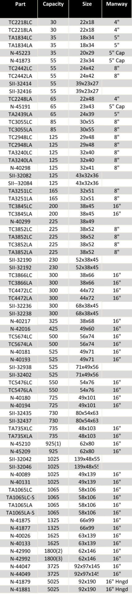 LC Series – Commercial Series – Designed to handle contents that have a maximum specific gravity of 1.5 at 73° F. Excellent impact and chemical resistance. Resin complies with U.S. Food and Drug Administration regulation 21 CFR 177.1520 (c) 3.1 and 3.2. Translucent* for visible content level. Molded in calibrations. Anti-surge baffles molded in on tanks – 525 gallons through 1625 gallons. Most sizes are available with steel platforms and straps for mounting on vehicles.