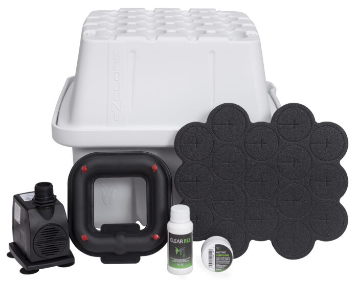 EZ-Clone® is proud to announce the introduction of the brand new 16 Site Low Pro System now in white. The overall height has been reduced, while increasing the structural integrity of the new proprietary lid and reservoir. It is manufactured from durable UV protected HDPE plastic. The lid has alpha numeric symbols formed directly into the plastic, which allows simple identification of multiple strains of cuttings and comes with four way finger slots for improved cloning collar extraction. The reservoir has an increased lip height, with an extended flange and drainage gutters, to ensure a leakproof design. These smaller systems utilize the same great Aeroponic Misting Technology as all of our larger systems. It’s perfect for cloning a variety of plants in small areas.