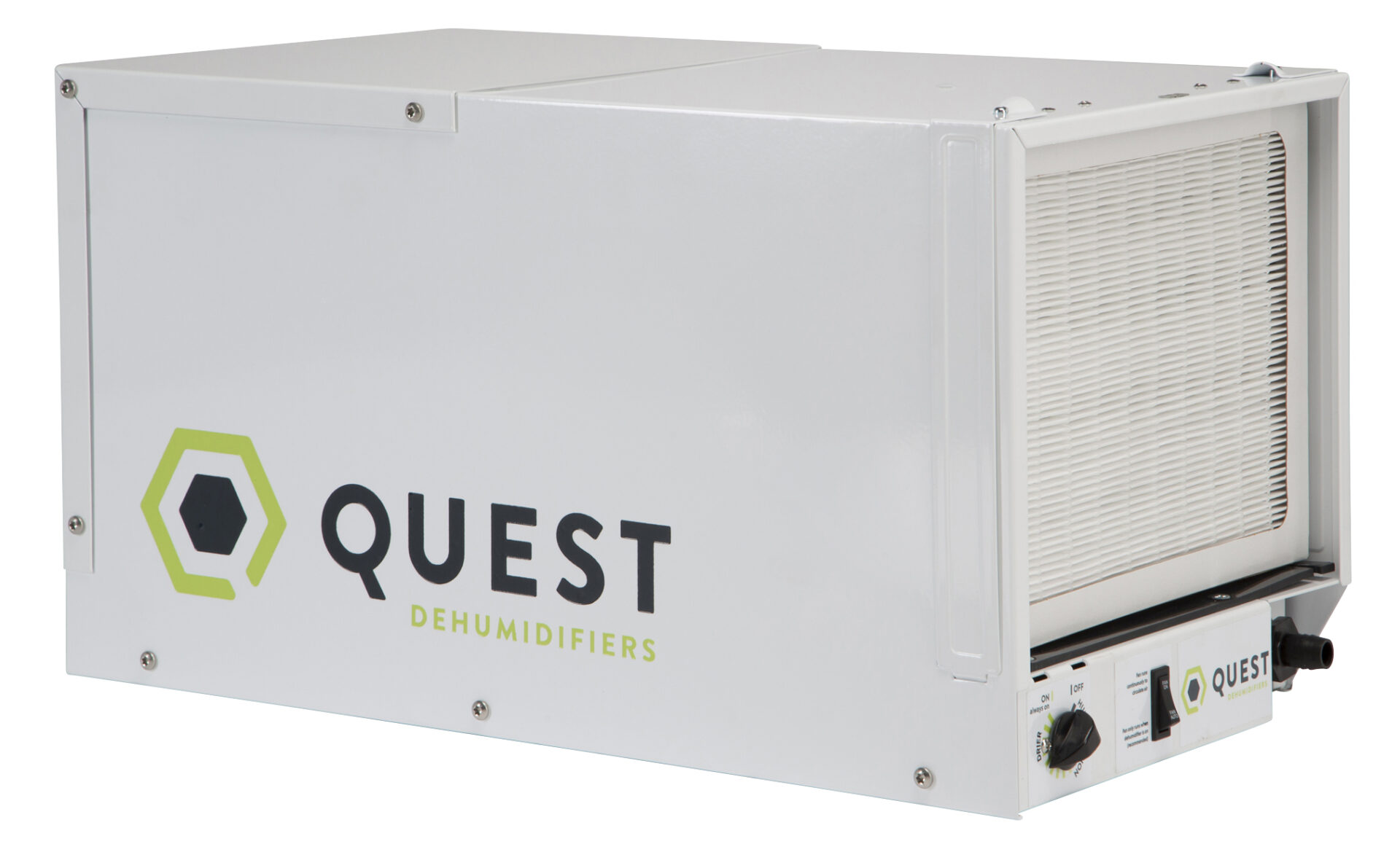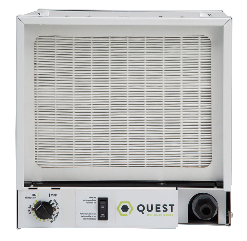 Quest 70 Pint Dehumidifier was designed to be placed overhead and out of the way, but can also be placed at ground level for plug and play operation. The Quest 70 Pint Dehumidifier was designed to provide improved value while still offering solid performance and energy efficiency. The Quest 70 Pint Dehumidifier provides the ultimate in flexibility for the most challenging space restrictions and specialized applications. 115 V, 60 Hz, 5.1 Amps, 2.37 L/kWh, 5.0 pints/kWh, operating range 33°F–110°F. Made in the USA. Warranty: 1 year parts and labor. 5 year compressor and refrigerant system.